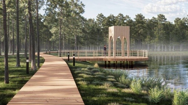 Для прогулок вокруг пруда будет организован пешеходный настил. Он защитит от грязи в межсезонье и сделает посещение этой зоны более комфортным, в том числе для маломобильных граждан.