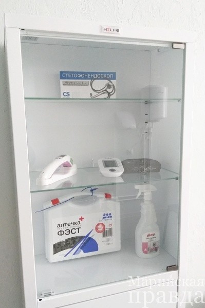 Три отдельных входа - с улицы, из зала ожидания и зоны персонала имеет медицинский пункт. Для экстренных случаев предусмотрены широкие двери и место подъезда машины скорой помощи. Оборудован пункт инвентарем медицинского назначения.