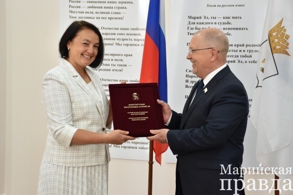 Председатель Государственного Собрания Марий Эл Михаил Васютин вручил памятный экземпляр Конституции республики директору Национальной библиотеки им. С.Г. Чавайна Ирине Щегловой. Издание, отметил руководитель законодательного органа, соответствует всем современным нормам, в том числе нормам орфографии и изменениям в действующем законодательстве.