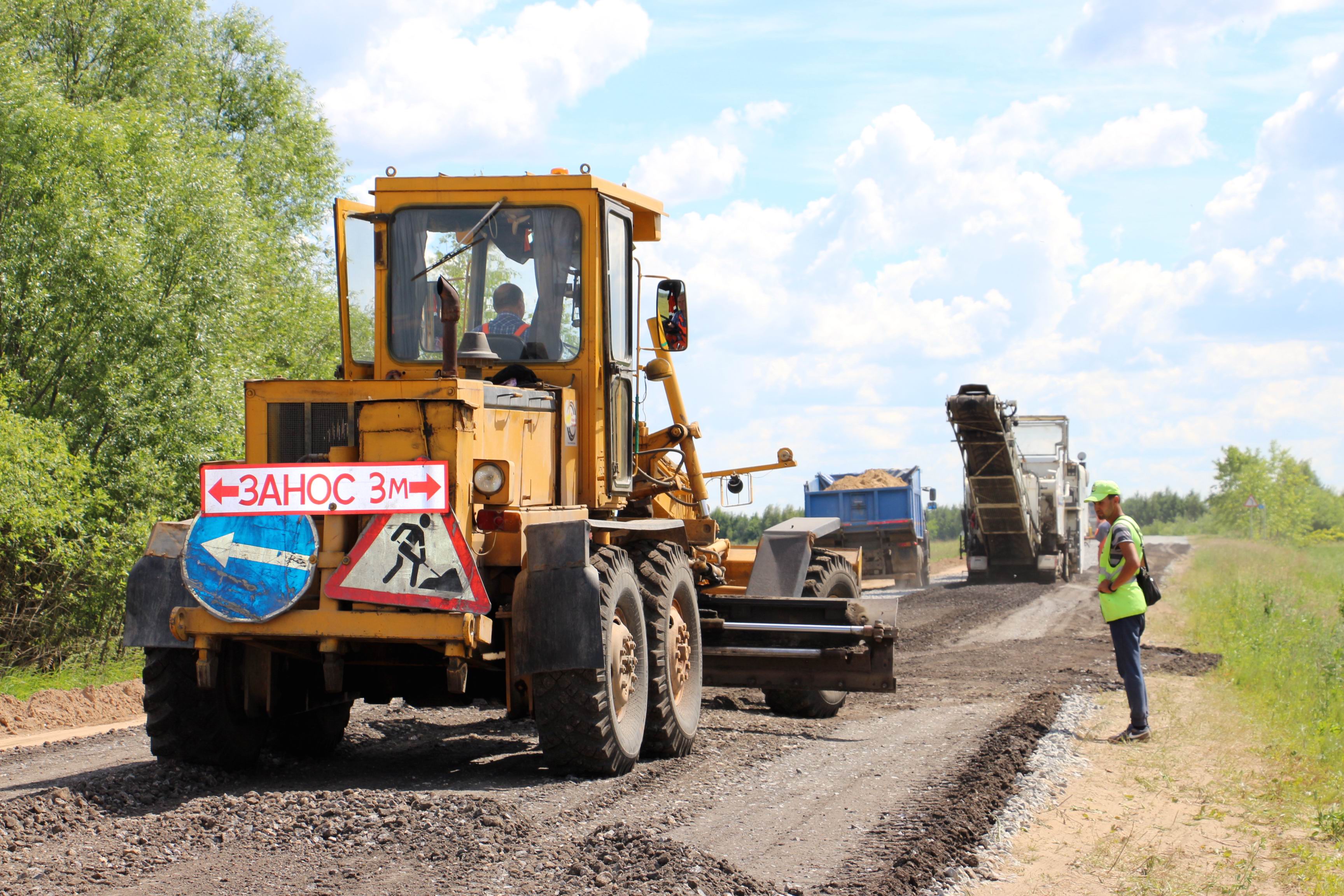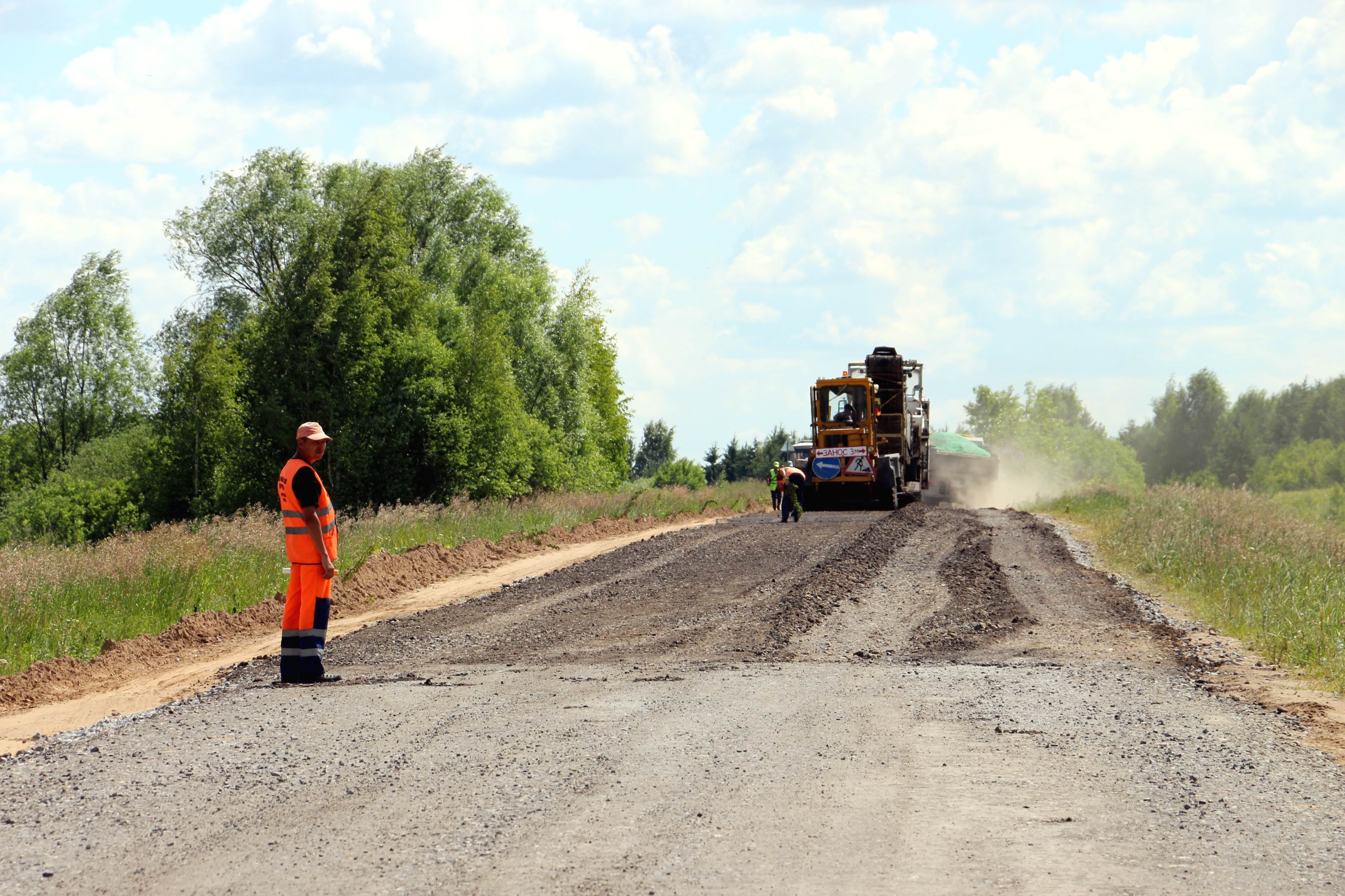 Сейчас проходит работа по холодной регенерации дорог. При помощи дорожной фрезы существующее покрытие перемалывается вместе с основанием и смешивается с гранитным щебнем и битумной эмульсией. Затем смесь выравнивают грейдеры и уплотняют катки. А уже после этого начинается укладка слоев основания и покрытия.