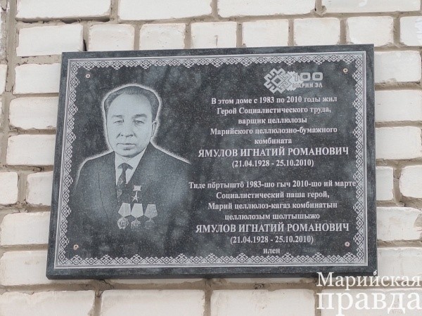 Отметим, что Игнатий Ямулов является уроженцем деревни Мари-Отары Исменецкого сельского поселения Звениговского района. В сентябре прошлого года в сельской школе, где учился Игнатий Романович, также по инициативе организации «Мари Ушем» была открыта мемориальная доска.– Помню этого человека. Когда училась в техникуме, проходила практику на Марбумкомбинате. Помню, портрет Игнатия Ямулова висел на доске почета. Нам про него рассказывали и ставили в пример, – рассказывает волжанка.