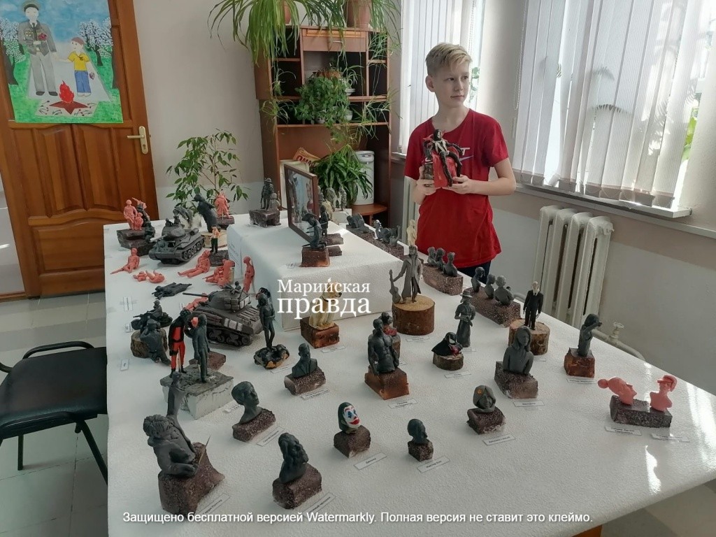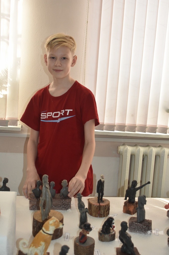 Мы встретились с Женей в холле Оршанского музея Воинской славы, где с середины февраля открылась выставка его работ. На широком столе – множество фигур, вылепленных из скульптурного пластилина, глядя на которые просто не верится, что это творчество шестиклассника.
