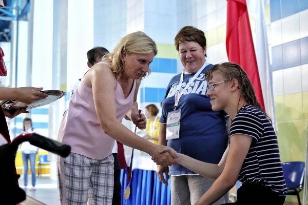 Сегодня, 15 июля, во Дворце водных видов спорта состоялась церемония награждения победителей и призеров первого дня соревнований по плаванию ПОДА. Министр молодежной политики, спорта и туризма Лидия Батюкова поздравила юных чемпионов с честной победой и пожелала им спортивных успехов.