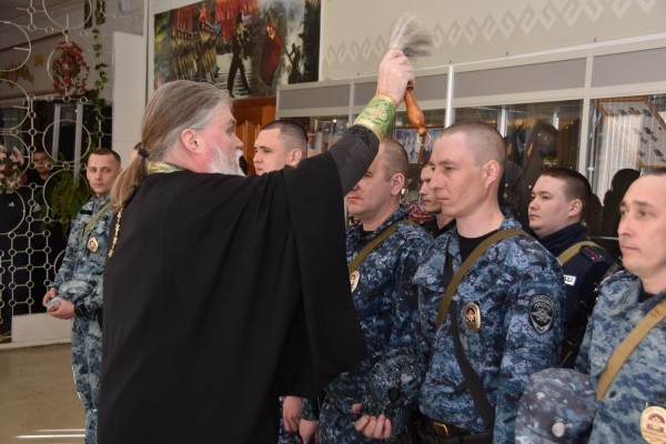 Представитель Общественного совета при МВД протоиерей Александр Бачурин пожелал стражам порядка душевного мира, светлых мыслей и мужества при выполнении задач на благо Отечества. Священник окропил каждого сотрудника святой водой и вручил им иконы Святого Георгия Победоносца.