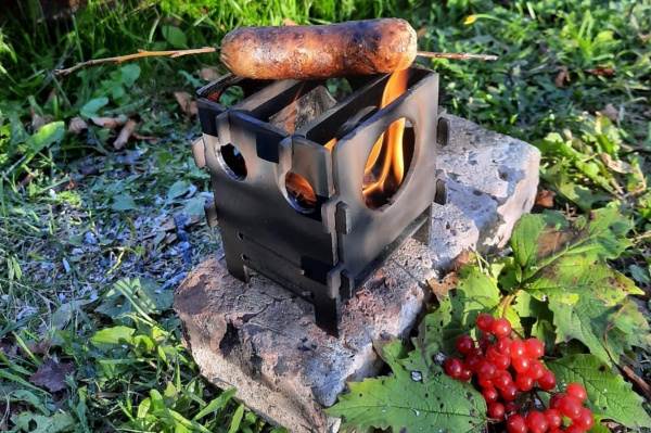 В разобранном виде печь состоит из семи деталей, вырезанных из 3-мм стального листа и аккуратно укомплектованных в специально пошитый чехол. Весит изделие полтора килограмма, а собирается, благодаря предусмотренным пазам, в течение нескольких минут. Называется оно «Щепач», поскольку в качестве топлива именно щепу и рекомендуется использовать.