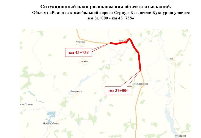 В Кукнурском сельском поселении приблизительно от села Кукнур до границы Марий Эл с Кировской областью будет отремонтирован участок дороги Сернур – Казанское - Кукнур. По информации, имеющейся на сайте госзакупок, рабочие приведут в порядок 12,7 километра дороги (км 31+000 – км 43+738). Сейчас она находится в неудовлетворительном состоянии, тогда как эта дорога соединяет республику с соседней областью, а кроме того, Кукнурское сельское поселение в последние годы стало одним из культурных центров Сернурского района, ведь именно здесь находится резиденция марийского Деда Мороза – Йушто Кугызы, в гости к которому приезжают туристические группы.