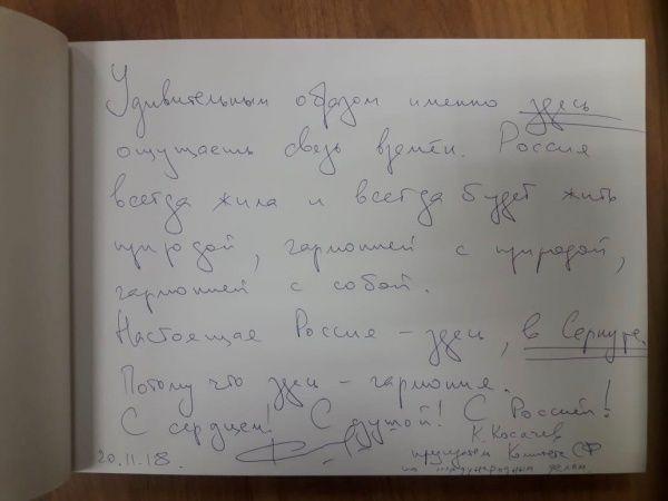 20 ноября сенатор посетил сырзавод в поселке Сернур. Он пообщался с руководством и сотрудниками, попробовал местные молочные продукты и воочию убедился в том, насколько завод оснащен технически. Также сенатор побывал и на местной козьей ферме. Результатами визита политик остался очень доволен, и даже описал свои впечатления в гостевых книгах. Константин Косачев считает, что настоящая Россия - здесь, в Сернуре, и что у сырзавода и фермы есть все необходимое для дальнейшего развития, сообщают представители предприятия.