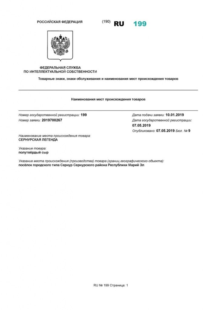 Новым брендом республики признали сыр «Сернурская легенда», успешно зарегистрированный «Роспатентом». 10 января на соответствующую процедуру была подана заявка, а 7 мая она была одобрена Федеральной службой по интеллектуальной собственности.