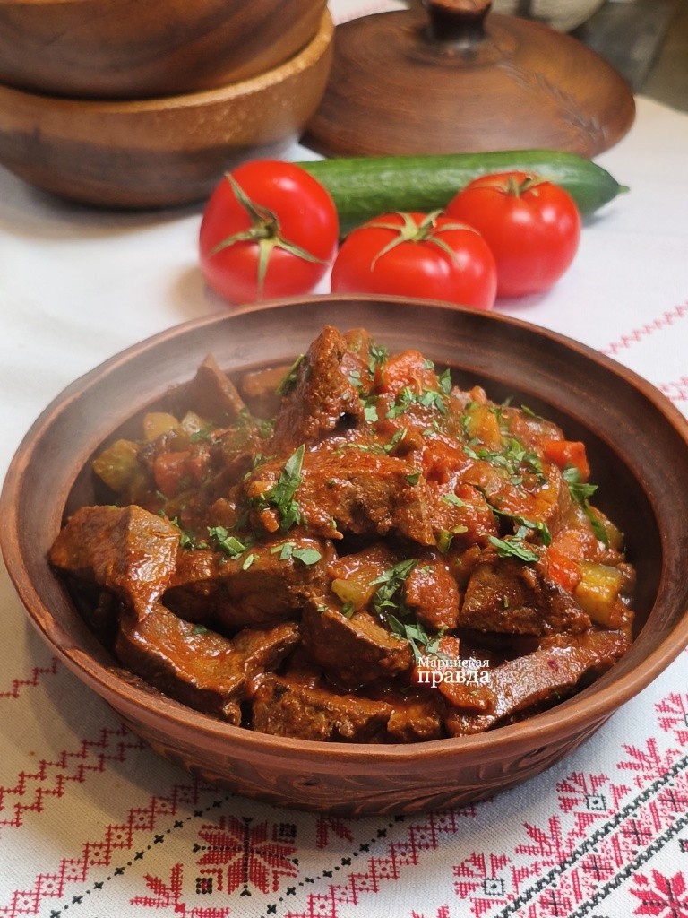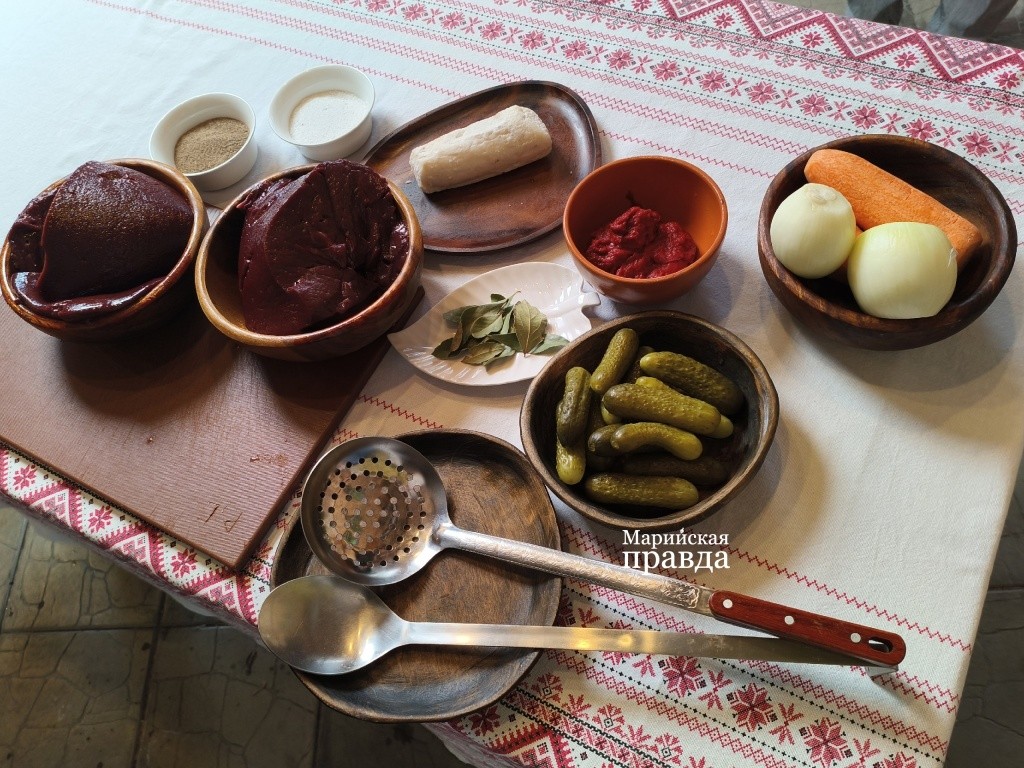 Стол украшает скатерть с марийским орнаментом, рядом с ним – печь, в которой полыхают полешки. Красивая картинка, как и понятный рецепт, создают особый эффект «Надо повторить» для читателя. И если изначально мне хотелось рассказать процесс приготовления нашим читателям детально, то сейчас хочется сохранить интригу, чтобы не повлиять на Его величество Впечатление. Ведь должно же быть место гастрономической магии? Впрочем, какие-то детали рецептуры вы можете подглядеть в нашем видео. Например, как именно влияют огурчики на вкус печени и почему субпродукт не стоит рубить мелко.