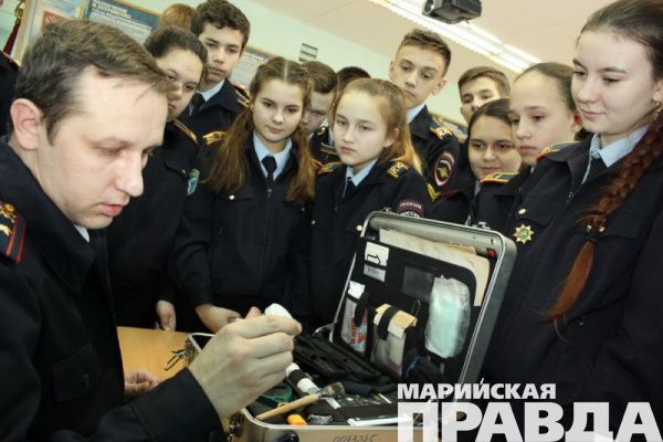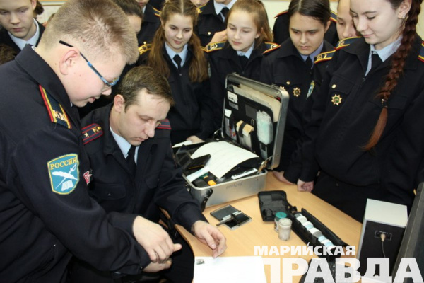 Школьники Марий Эл исследовали криминалистический чемодан, кадетов также научили снимать отпечатки пальцев и пользоваться специальным порошком.