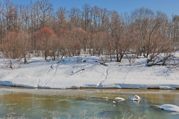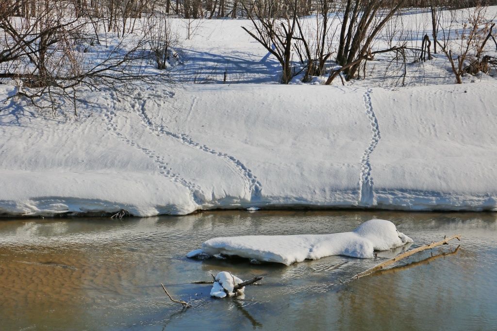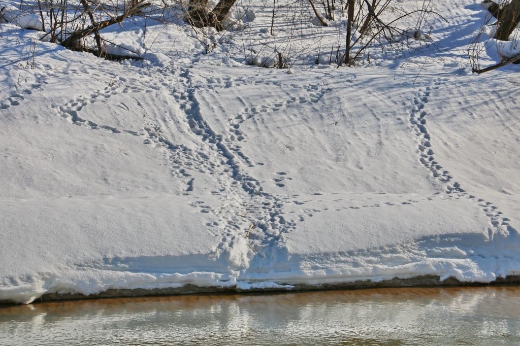 Лесные строители, бобры, уже приступили к своей повседневной работе по возведению плотин. Об это свидетельствуют следы животных на снегу, ведущие к реке.