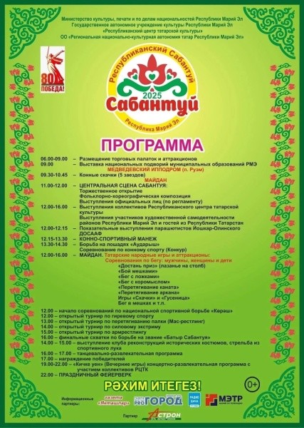 12:00-16:00 – Выступления коллективов Республиканского центра татарской культуры. Выступления участников художественной самодеятельности районов Республики Марий Эл и гостей из Республики Татарстан.