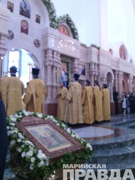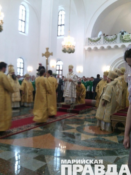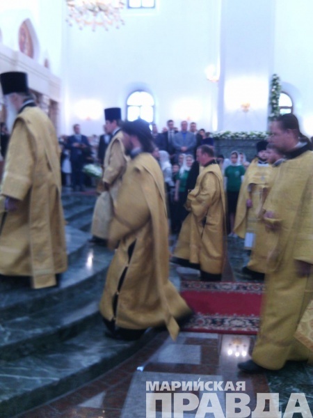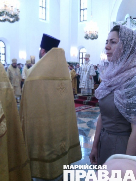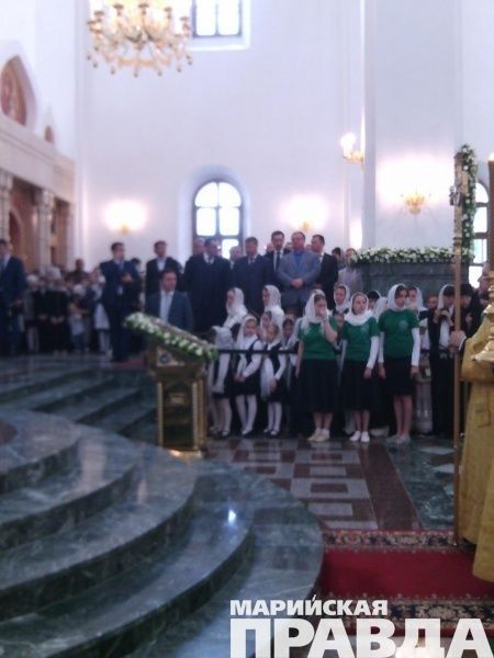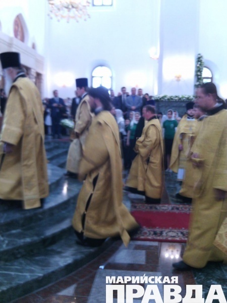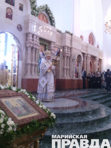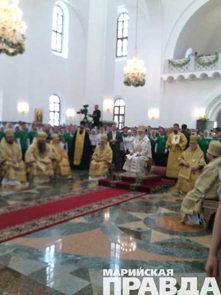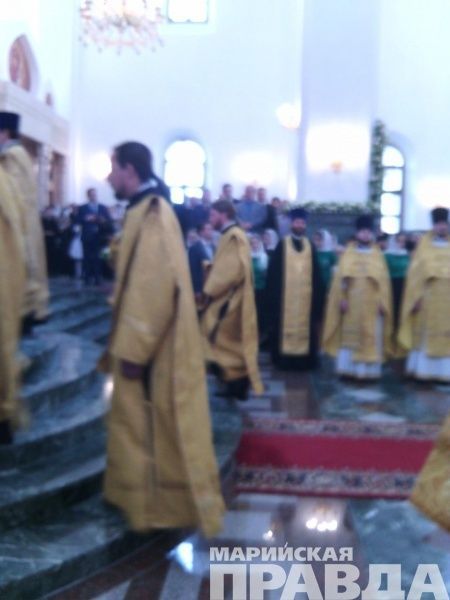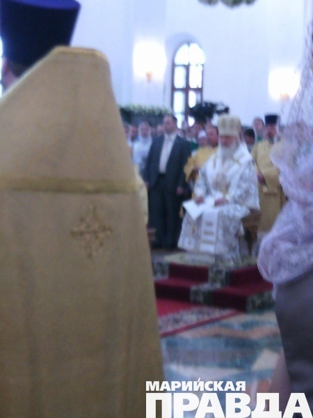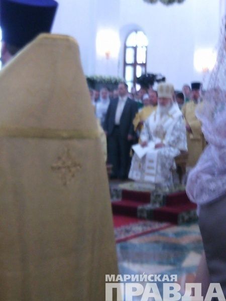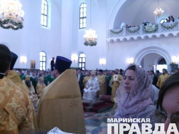 - Сейчас Его Святейшество, Святейший патриарх Московский и всея Руси Кирилл, прибывший сегодня, 12 июня в марийскую столицу, возглавляет Божественную литургию в храме на соборной площади, также будет совершен чин Великого освящения собора Благовещения Пресвятой Богородицы в Йошкар-Оле. Вместе с другими верующими в храме молится и глава Марий Эл Леонид Маркелов, во много благодаря которому и был построен храм на берегу Малой Кокшаги.