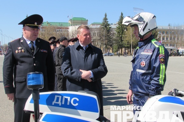 В Йошкар-Оле на площади имени Ленина в честь 71 годовщины Великой Победы состоялся гарнизонный развод полицейских нарядов, на котором глава Марий Эл Леонид Маркелов вручил сотрудникам отдельного батальона ДПС ГИБДД МВД по Марий Эл ключи от четырех новых мотоциклов.
