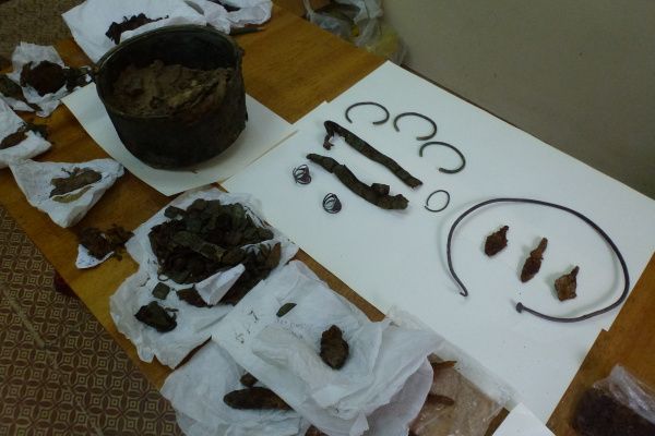 Как установили археологи, погребенный мужчина имел довольно высокий социальный статус. Об этом говорят, например, богатый пояс с бронзовыми накладками в виде квадратиков и сердечек, а также бронзовый котел, установленный прямо на перевязанные ремнем ноги. Содержимое котла еще предстоит определить - оно сильно перемешано с песком, и тут нужна кропотливая работа.