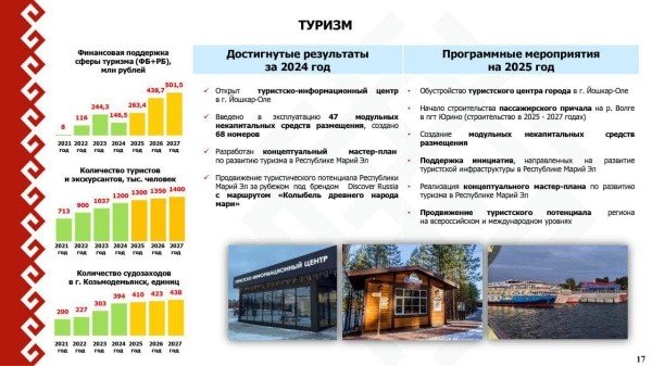 В рамках нацпроекта «Туризм и гостеприимство» в 2025 году 46,5 миллиона рублей федеральной субсидии будет направлено на обустройство туристского центра Йошкар-Олы, проведение событийных мероприятий и поддержку общественных инициатив в сфере туризма.