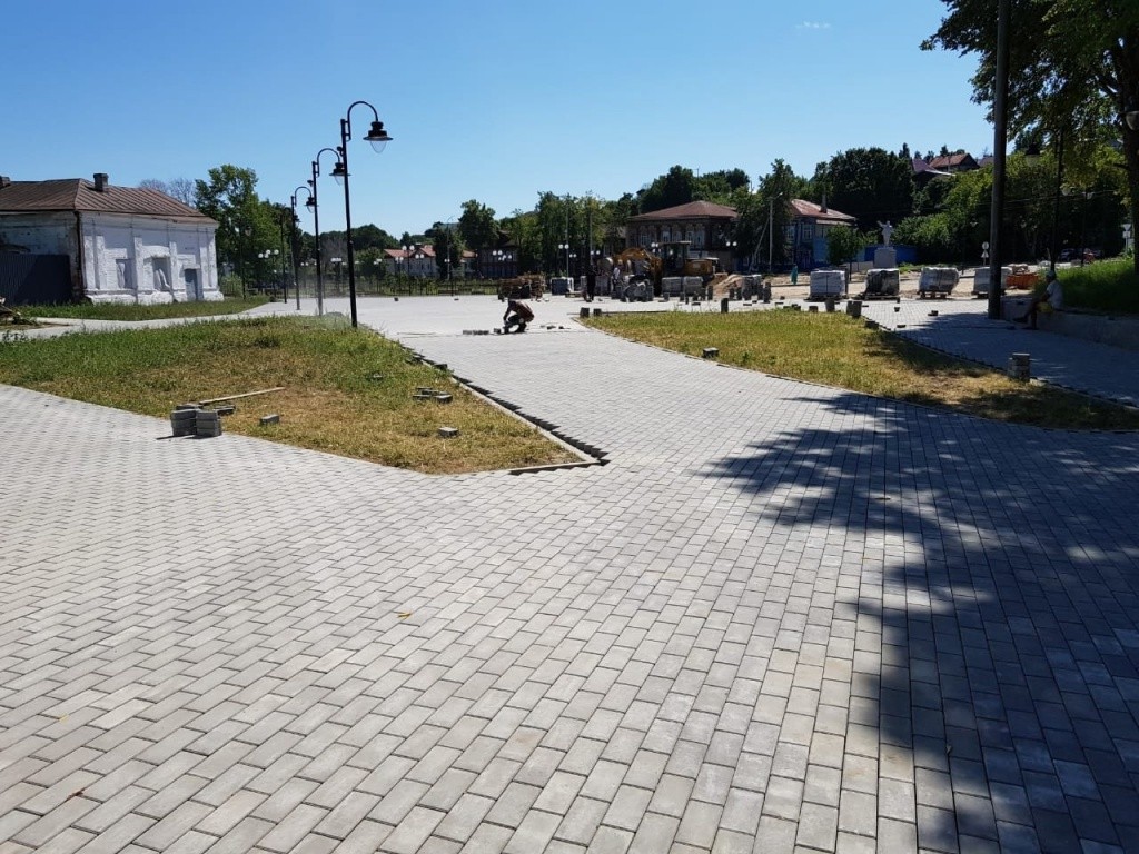 На сегодняшний день завершается благоустройство в парке, уже залит парапет вдоль музея Остапа Бендера и здания магазина «Якорь», рабочие продолжают укладывать на площади брусчатку, устанавливать бордюры, занимаются устройством водоотводов.