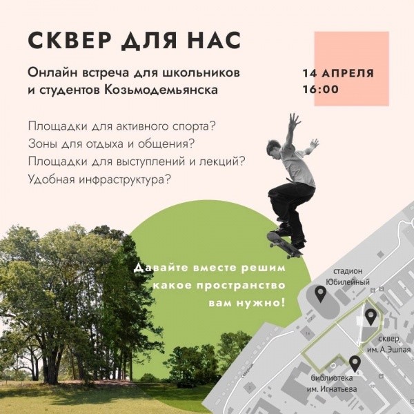 В Козьмодемьянске определят, каким будет сквер у Детской школы искусств им. Эшпая. 14 апреля пройдет онлайн-встреча "Сквер для нас", принять участие в которой приглашают школьников и студентов.