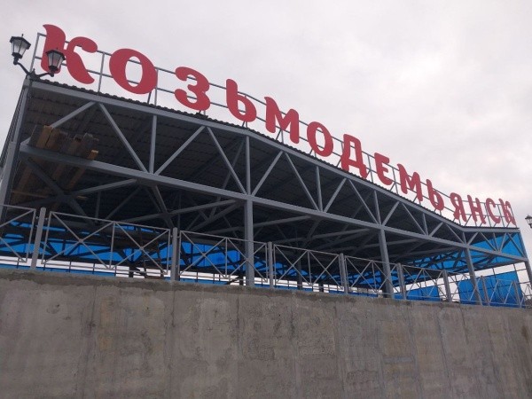 Основные работы на причале уже завершены, работники подрядной организации монтируют перила и ограждения на лестницах и пандусах. Сверху на пассажирском павильоне появилась надпись "Козьмодемьянск".