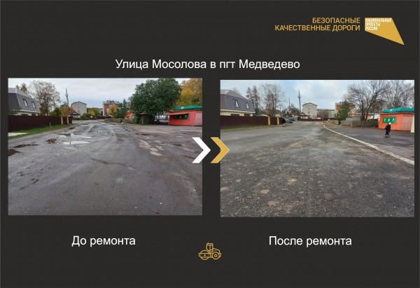 К строительным работам специалисты подрядной организации «Экспертдорстрой» приступили в октябре нынешнего года. На улице Мосолова выровняли дорожное покрытие, уложили новый асфальт и отремонтированные тротуары. Ремонт здесь был необходим, так как участок дороги протяженностью 339 м ведет сразу к трем достопримечательностям поселка Медведево: Медведевскому историко-художественному музею, мини-зоопарку «Чудо-остров» и Мечети Гайша.