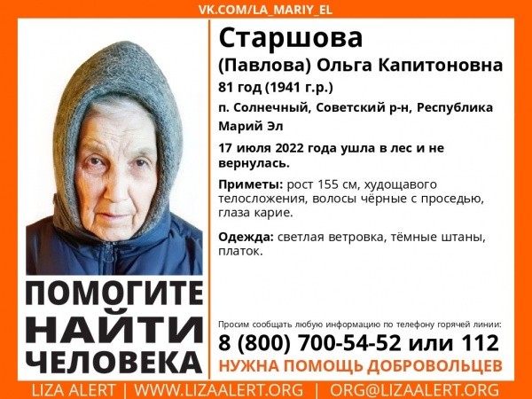 Информацию о пропавшей опубликовал поисково-спасательный отряд "Лиза Алерт". Ольга Капитоновна Старшова (Павлова), живущая в поселке Солнечный Советского района, отправилась в лес в воскресенье, 17 июля, и домой не вернулась.