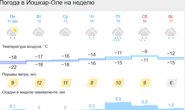 В Йошкар-Оле в субботу температура воздуха максимально снизится до -9 градусов, как в Волжске и Звенигове. В Козьмодемьянске в этот день ожидается -8 градусов. В основном дни будут пасмурными, а с пятницы к ним добавятся обильные снежные осадки.