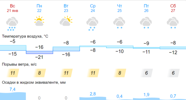 В Волжске ситуация с погодой аналогична марийской столице. Максимально низкая температура в -15 градусов ожидается в понедельник, в остальные дни столбик термометра опустится не ниже -9 градусов, как и в Звенигове. В Козьмодемьянске солнечных дней будет меньше, а снежные осадки станут обильнее. Во всех городах с середины недели пройдет небольшой снег.