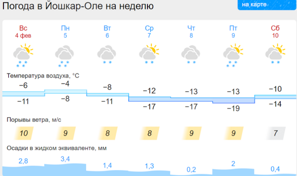 В Волжске столбик термометра начнет опускаться ниже ближе к концу недели, как и в Звенигове. В Козьмодемьянске солнечных дней ожидается больше, однако в четверг стоит ожидать температуру -14 градусов. Во всех городах практически каждый день ожидаются снежные осадки. Лед на водоемах республики всё еще крепкий. В Йошкар-Оле лед на Малой Кокшаге сможет выдержать максимум 35 человек.