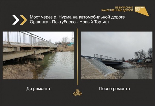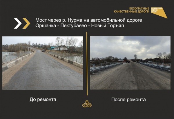 Мост на автомобильной дороге Оршанка - Пектубаево - Новый Торъял находился в аварийном состоянии. Реконструкцию провели по национальному проекту "Безопасные качественные дороги". Специалистам пришлось полностью разобрать и построить сооружение заново - они возвели береговые опоры, смонтировали пролетное строение, устроили настил и перила, укрепили откосы насыпи, заасфальтировали подходы к мосту, установили барьерное ограждение и знаки.