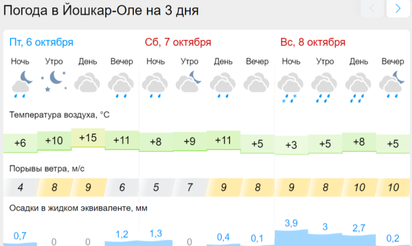В Волжске в эти дни появится солнышко, однако дожди также пройдут на протяжении всех выходных, как и в Звенигове. А в Козьмодемьянске пасмурная погода и несколько дней дождей напомнят о том, что на дворе осенняя пора.