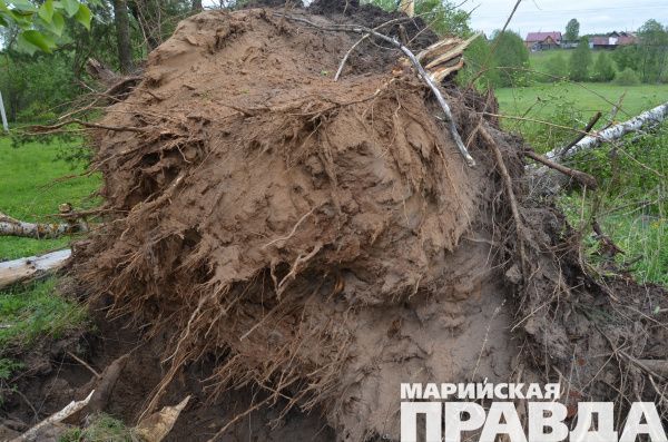 На околице села Салтакъял (Марий Эл) буря прямо с корнями выдрала огромное дерево.