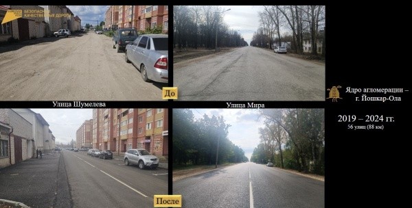 В этом году в Йошкар-Оле отремонтировали восемь улиц – Складскую, Яналова, Мира, Петрова, Кокшайский проезд, Большое Чигашево, Шумелёва, Садовую. Общая протяженность ремонтных работ составила 9,5 км. Ремонт улицы Шумелёва завершил сезон. На ней уже завершены все основные работы, сейчас проводится обустройство улицы.
