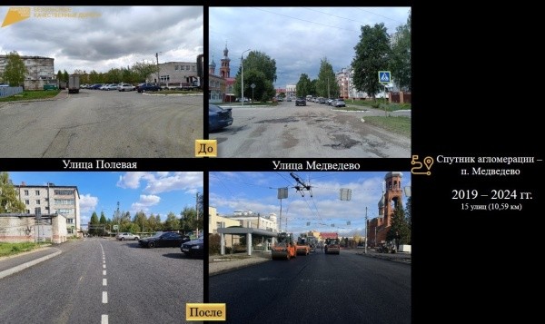 Кроме столицы, в Йошкар-Олинскую городскую агломерацию входят поселки Медведево, Оршанка и Советский. За 6 лет в Медведево отремонтировали 15 улиц общей протяженностью 10,59 км. Завершающим ремонтом этого года стала улица Медведево, основные работы на которой завершатся в этом году.