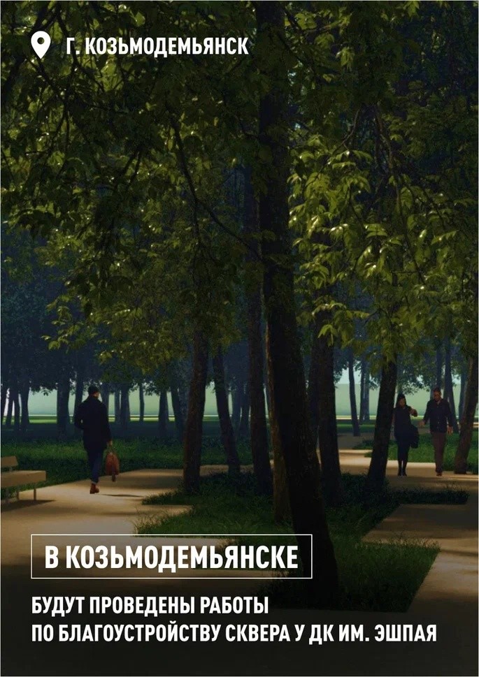 В Козьмодемьянске приятные перемены ожидают сквер композитора Эшпая неподалеку от Дворца культуры. Здесь появится современное освещение, система видеонаблюдения, беседка, сцена и детские, а также спортивные площадки, фудкорты и даже фонтан с арт-объектами! Думается, горожане будут рады такому подарку.