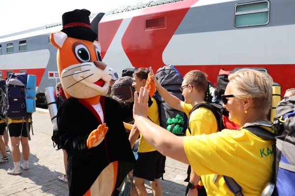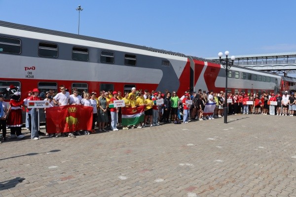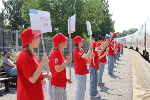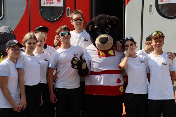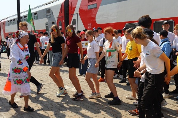 На перроне гостей радостно встречали активисты Движения Первых вместе с символами республики - медведем и лосем, а также талисманами Йошкар-Олы - йошкиными котом и кошкой. Задорные марийские мелодии и кружащийся хоровод создали атмосферу гостеприимства и подарили участникам незабываемые моменты радости.
