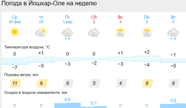 В Волжске ситуация с погодой аналогична марийской столице, как и в Звенигове. В Козьмодемьянске всю неделю столбик термометра будет показывать +1 градус. Во всех городах засияет яркое предвесеннее солнышко. Будьте готовы, что 6 марта в Марий Эл зазвучит сирена системы оповещения.