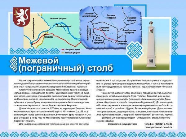 «Столб пограничный, ХIХ века» был установлен у бывшего Московского тракта на высоком холме как пограничный между бывшими Нижегородской и Казанской губерниями в середине ХIХ века. Он имел вид усеченной пирамиды. Сегодня в России сохранилось лишь два таких столба. Есть информация о том, что в 1833 году мимо этого столба в Казань ехал известный поэт Александр Пушкин. В 1932, когда была образована Марийская автономная республика, столб потерял свое значение.