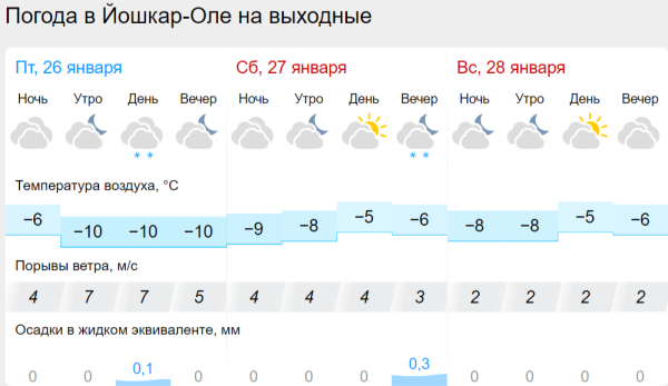 В Волжске столбик термометра опустится до -9 градусов, в субботу целый день ожидаются небольшие снежные осадки, как и в Звенигове. В Козьмодемьянске не будет ни снега, ни дождя, а средняя температура воздуха варьируется около -6 градусов.