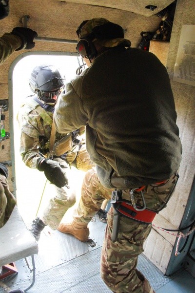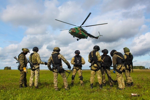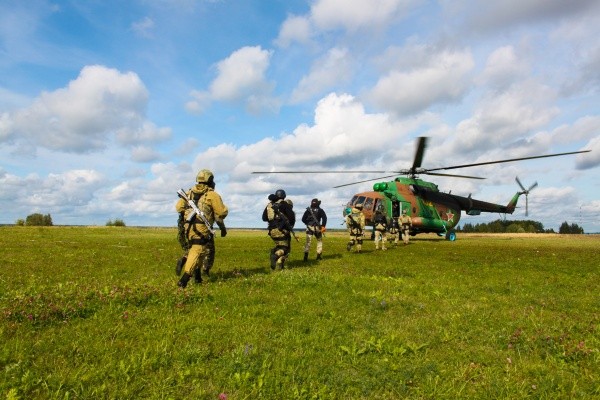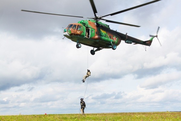 Во время практических занятий сотрудники ОМОН и СОБР в полной боевой экипировке отработали нормативы по десантированию при зависании вертолета Ми-8 на различных расстояниях от земли и оперативное рассредоточение на площадке приземления.
