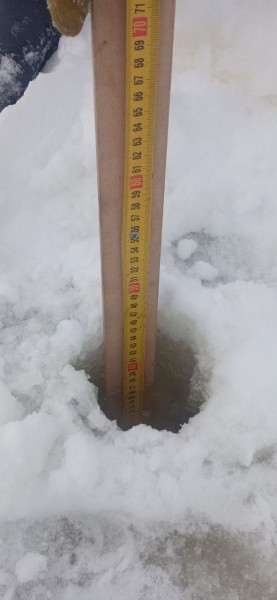 В Юрине наледь 5 см, 35-40 см снег со льдом, основной лед до 25-30 см.