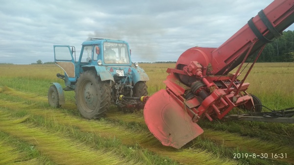 В этом году для уборочных работ году в оршанское хозяйство приобрели три прицепных льноуборочных комбайна и два новых трактора. На данный момент уборку ведут два льноуборочных комбайна и три косилки.