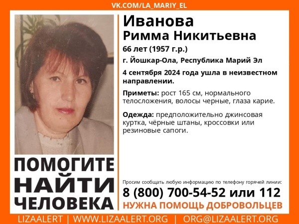 Женщина ушла в Йошкар-Оле в неизвестном направлении. Узнать её можно по приметам: рост 165 см, нормальное телосложение, глаза карие, чёрные волосы. Предположительно была одета в джинсовую куртку, чёрные штаны, кроссовки или резиновые сапоги. С собой взяла чёрное ведро.А местонахождение 56-летнего Сергея Николаевича Косолапова неизвестно со 2 сентября.