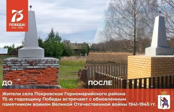 В одном из сёл Горномарийского района Марий Эл силами сельчан обновлён памятник воинам Великой Отечественной войны 1941-1945 годов. Об этом сообщается в официальном паблике Вконтакте Правительства Марий Эл.