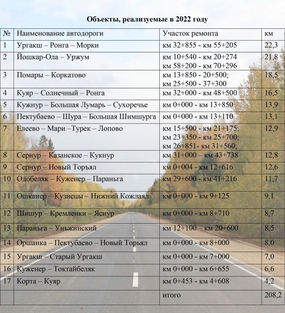 Также на всем протяжении отремонтируют дорога Шишур – Кремленки – Яснур: от автомобильной дороги Оршанка – Пектубаево – Новый Торьял до деревни Яснур.