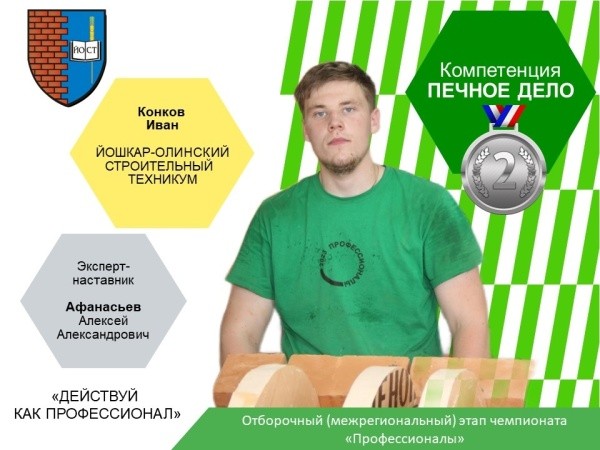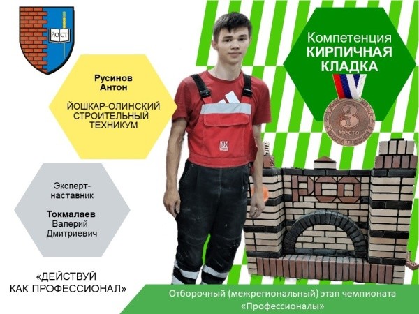 В Региональном методическом центре развития квалификаций поделились радостными новостями. Студент Йошкар-Олинского строительного техникума Иван Конков стал серебряным призером по компетенции «Печное дело» на отборочном (межрегиональном) этапе Всероссийского чемпионатного движения по профессиональному мастерству «Профессионалы». Другой студент Йошкар-Олинского строительного техникума ‒ Антон Русинов ‒ занял третье место по компетенции «Кирпичная кладка» Молодые специалисты успешно выполнили задания на площадках Республики Северная Осетия – Алания.