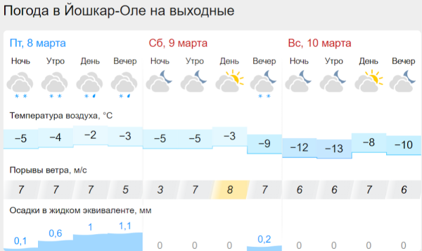 В Волжске снегодождь пройдет и в субботу. В Звенигове и в Козьмодемьянске самым благоприятным днем станет суббота - столбик термометра опустится до - 2 градусов. В эти дни во всех городах иногда будет показываться солнышко. Также, в выходные автоинспекторы проверят водителей Марий Эл на трезвость.