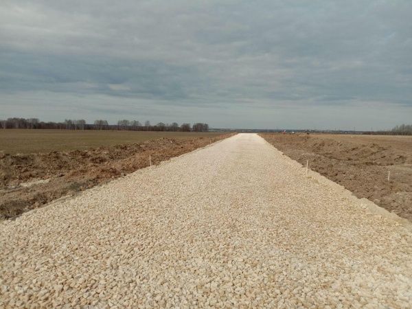 Прокладывается песчано-подстилающий слой дорожной одежды из мелкого песка. На втором участке выполняется устройство основания из щебня.