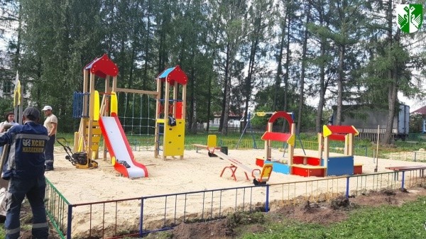 Уже скоро на площадках зазвучат детские голоса и веселый смех. Работы проходят с соблюдением всех правил безопасности.
