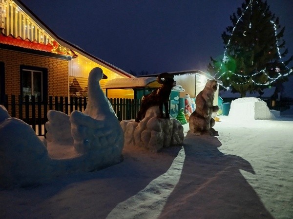 В этом году пространство около дома Тымбаршевых украшают не просто Дед Мороз и Снегурочка. К традиционным сказочным персонажам присоединился герой сказки Киплинга Маугли со своими друзьями Каа, Багирой и Балу.