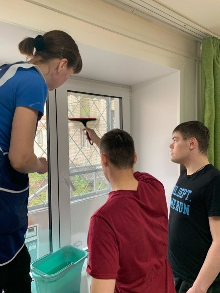 Ребята с инвалидностью, находясь в тренировочной квартире, учатся самостоятельности в быту. Это приготовление пищи, мытье посуды, уборка дома и многое другое. В этом им помогают два педагога. Ребята учатся ходить в магазин, выбирать продукты, оплачивать покупки, обращаться с деньгами.